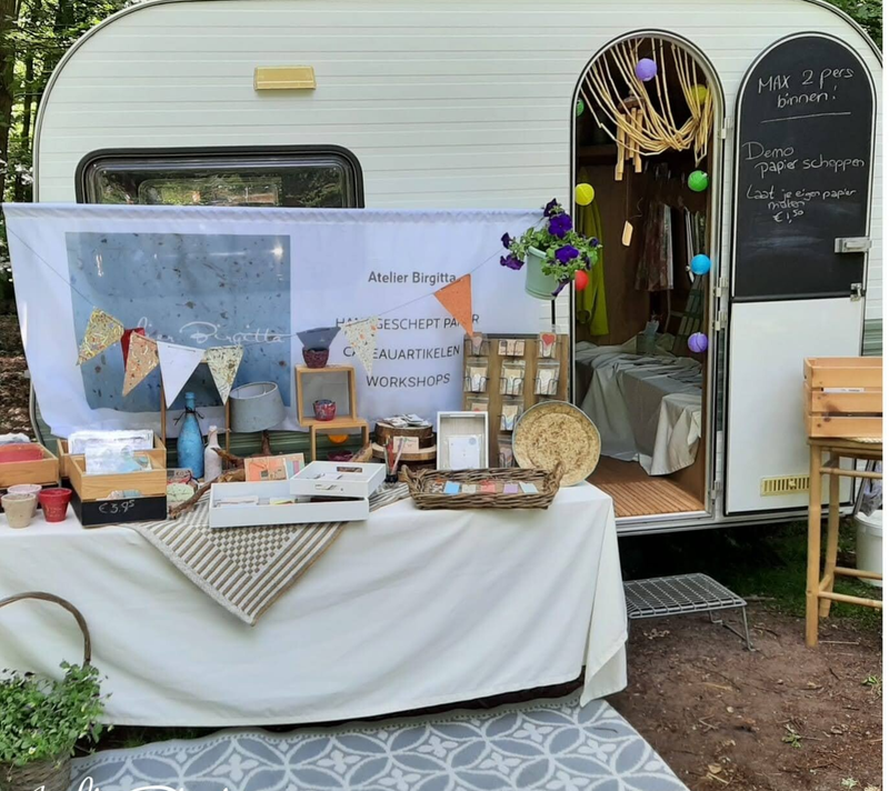Niet te groot, ze passen precies overdwars in de caravan. Toch groot genoeg om 10 mensen kwijt te kunnen tijdens de workshops.